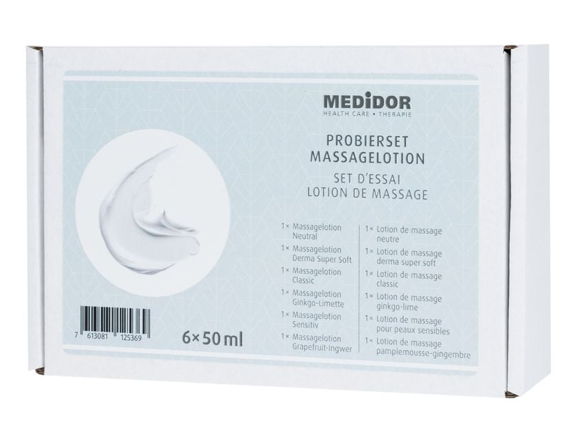 Das Medidor Probierset mit 6 x 50 ml Massagelotion hat für jeden Geschmack etwas dabei. Es eignet sich auch als Geschenk.