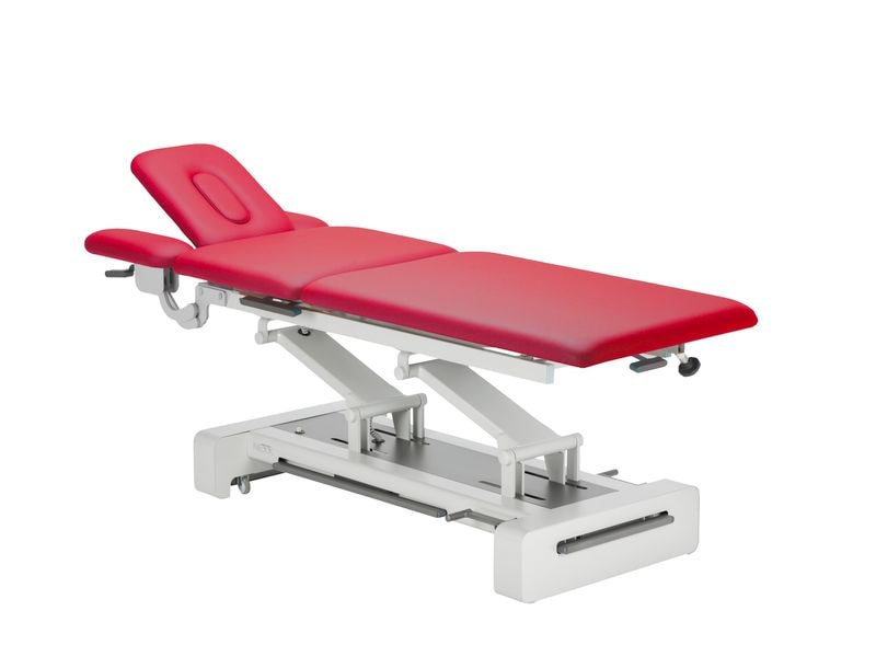 1 Motor für die Höhenverstellung. Hydraulische Liegen werden mittels Fusspedal verstellt.