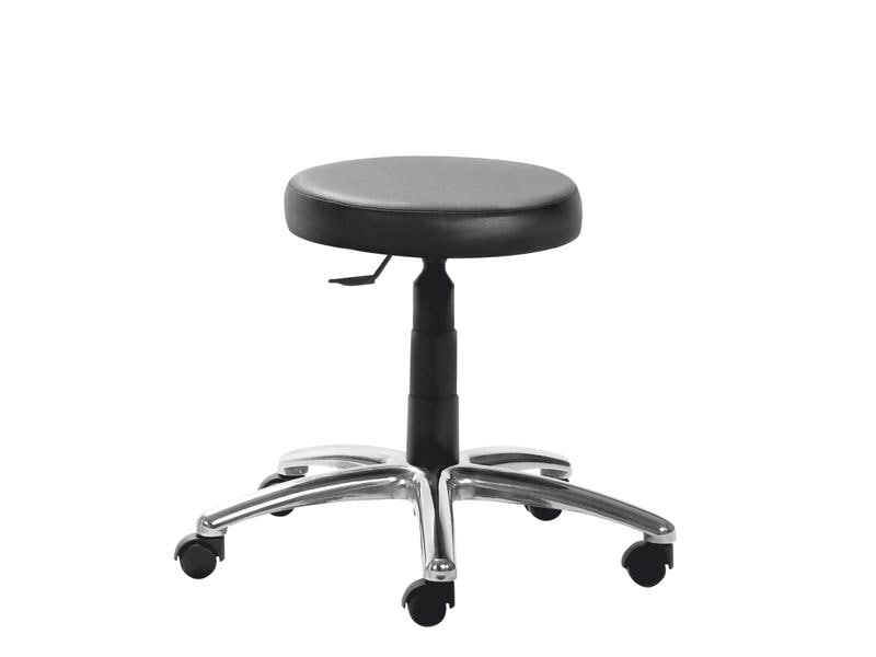 Drehhocker mit Ringauslösung mit Kunstleder für höchste Ansprüche im Objektbereich. Äusserst strapazierfähig und robust, schmutzabweisend, desinfizierbar, hygienisch und leicht mit Wasser und Neutralseife zu reinigen. Hautverträglich – angenehm weich. Sehr gute Lichtechtheit.