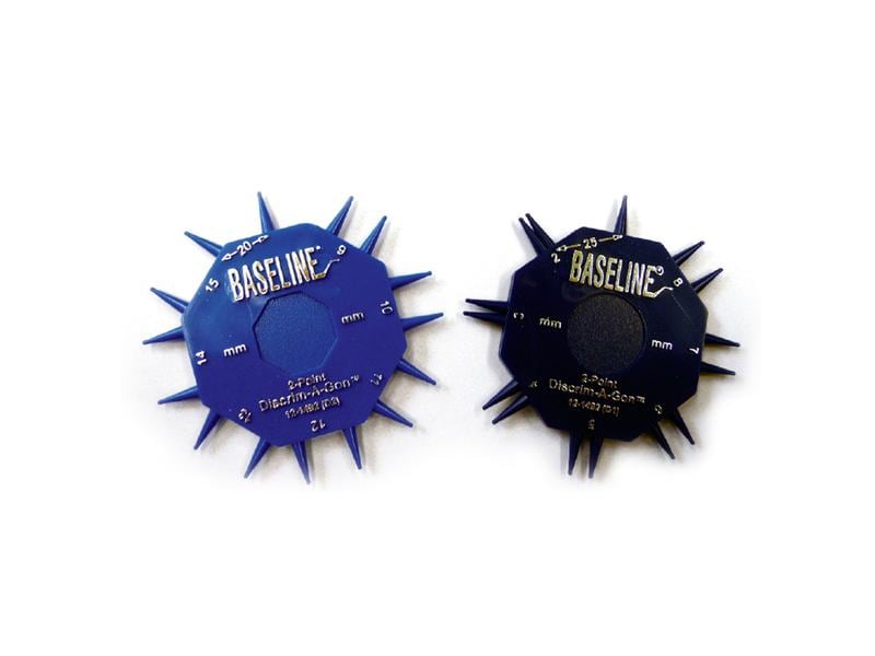 The Baseline DISCRIM-A-Gon is a 2-point pulse acquisition set and includes two pulse acquisition wheels. Each octagon measures a different area with 8 marked, fixed 2-point intervals spaced 1mm to 25mm apart. This easy to use plastic wheel is the perfect sensor meter.
