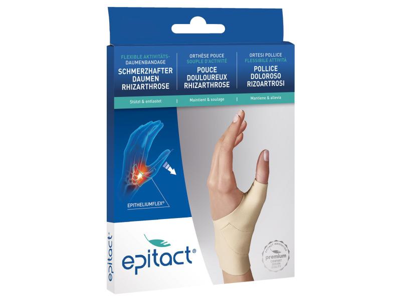 The flexible thumb support from Epitact provides support and relieves pressure on the thumb. When worn daily, the support helps to relieve joint pain in the thumb saddle joint (rhizarthrosis) by helping the thumb to achieve a comfortable resting position and limiting traumatizing micro-movements. The support also retains local heat thanks to the EPITHELIUMFLEX silicone insert and thus has a pain-relieving effect. As the brace is extra-thin, the full functionality of the hand is maintained in everyday life and it is also possible to wear a watch or jewelry. The brace also has no Velcro fasteners that could damage clothing and is machine washable.