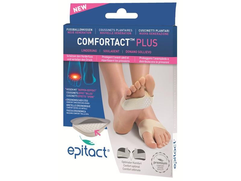 The COMFORTACT PLUS forefoot cushions were developed to protect the forefoot from pressure. The specially developed EPITHELIUM 26 silicone gel module with "nub effect" is located on the ball of the foot, ensuring comfort for the forefoot and optimally distributing pressure. The ergonomic bridge, which adapts to the natural shape of the big toe, avoids irritation in the spaces between the toes and for maximum comfort. The exclusive fit and the lasting elasticity of the fabric optimize the hold on the foot. In addition the fineness of the cushions makes it possible to wear tight shoes and limits the feeling of instability when walking.