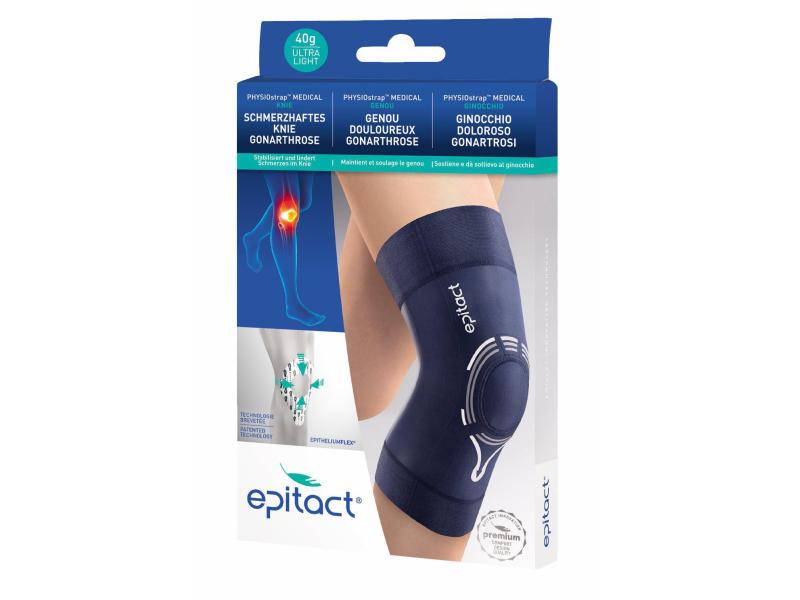 The Epitact Physiostrap Medical knee support relieves painful and weak knees. It is therefore suitable for osteoarthritis of the knee, kneecap problems and weak ligaments. The patented EPITHELIUMFLEX silicone support and the high-performance compression material protect the knee and enable the continuation or resumption of daily activities. The support therefore helps to maintain mobility. It is extra-thin (less than 40 g) and can be worn under normal clothing without any uncomfortable feeling in the hollow of the knee. The silicone-coated elastic straps provide excellent support. The support is also machine washable at 30°C. Size Size S is suitable for a knee circumference of 35 to 38 cm. To determine the right Size , measure the circumference of your slightly bent knee. To do this, place the measuring tape in the middle of the kneecap.