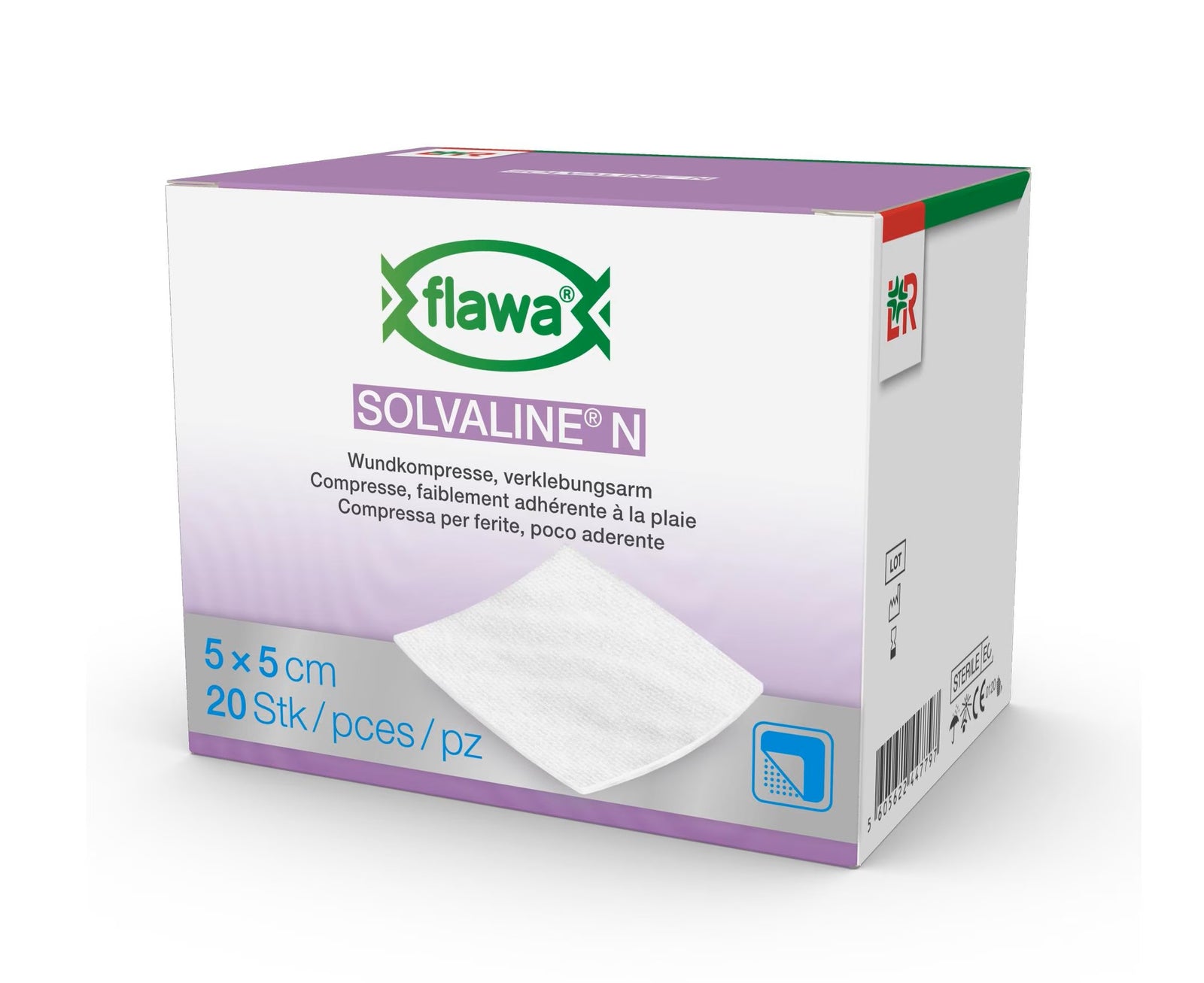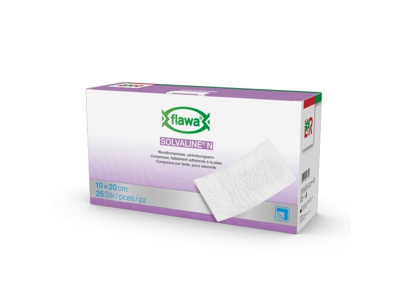 Solvaline N is a low-adhesion wound dressing that is particularly suitable for the treatment of exuding wounds, post-operative wounds, 2nd degree burns and for the initial treatment of cuts and abrasions. The compress can be used on both sides thanks to a perforated polyethylene film on the top and bottom and quickly drains the fluid into the highly absorbent viscose/polyester core. The Size can be cut to size for suit individual requirements. Properties: - highly absorbent viscose/polyester core - perforated polyethylene film on both sides for rapid absorption of wound exudate - low adhesion - can be used on both sides thanks to film application on the top and bottom - can be cut to size - sterile Application: - for exuding wounds - for wounds in the post-operative area - for initial treatment, e.g. of cuts and abrasions - for 2nd degree burns