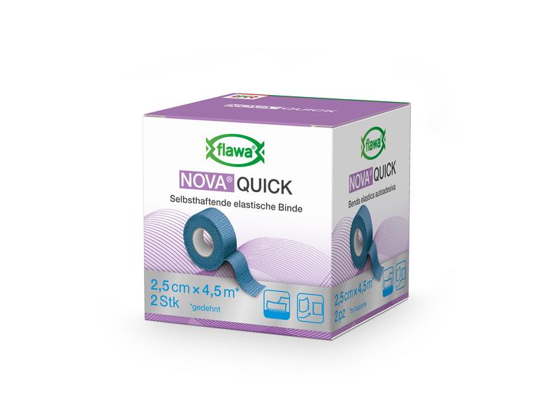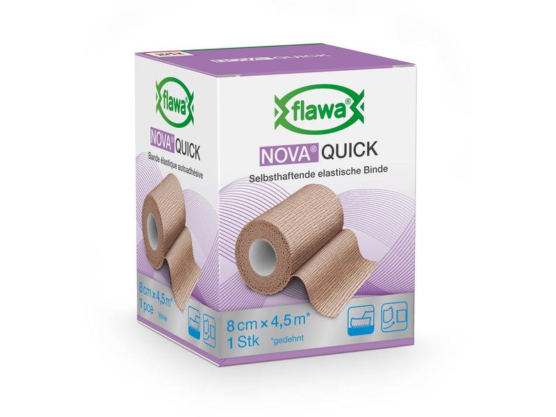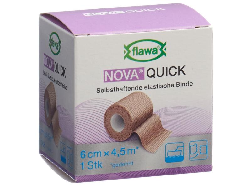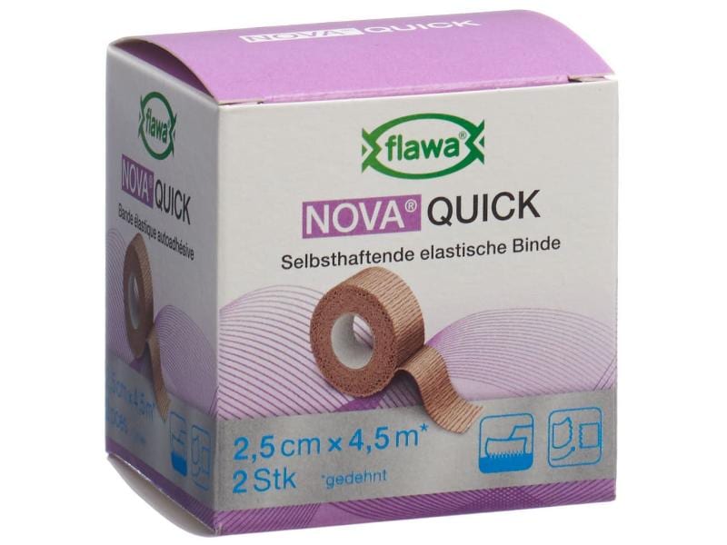 NOVA Quick makes the application of non-slip support and relief bandages particularly easy. The cohesive, permanently elastic support and relief bandage can be torn by hand as required and thus quickly cut to the desired length without the need for scissors. Nova Quick is suitable for treating musculoskeletal injuries and can be used preventively as a light compression bandage. During application, the individual layers adhere well to each other so that no further fixation is necessary. The material does not stick to the skin, hair or clothing. The natural rubber latex-free fabric is skin-friendly and permeable to air. Application: Only use on intact skin. for single use. Properties: - can be torn at will - natural rubber latex-free - no additional fixation necessary - non-slip - easy application - permeable to air - skin-friendly - 3-year shelf life