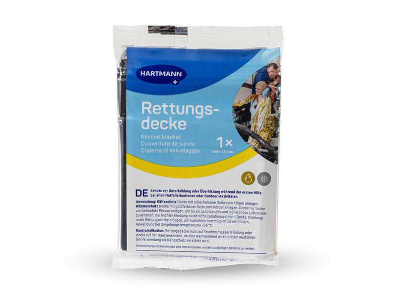 The rescue blanket offers protection against heat and cold and is suitable in various emergency situations such as traffic, skiing, industrial and mountain accidents. The dimensions are 150 x 210 cm