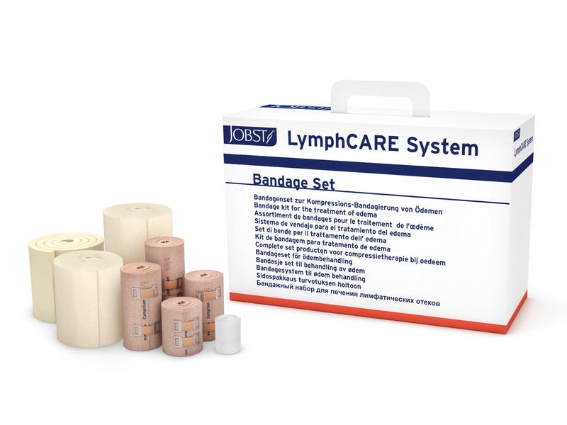 Compression therapy supports the tissue from the outside with pressure, allowing excess tissue fluid and its dissolved components to drain into the lymph vessels and veins. Jobst LymphCare contains all the materials required for the professional bandaging of an arm or leg in accordance with the principles of complex physical decongestive therapy. All products are clearly arranged, easy to use and easy to handle. Jobst LymphCare consists of cotton, synthetic fibers, synthetic latex and natural latex.
