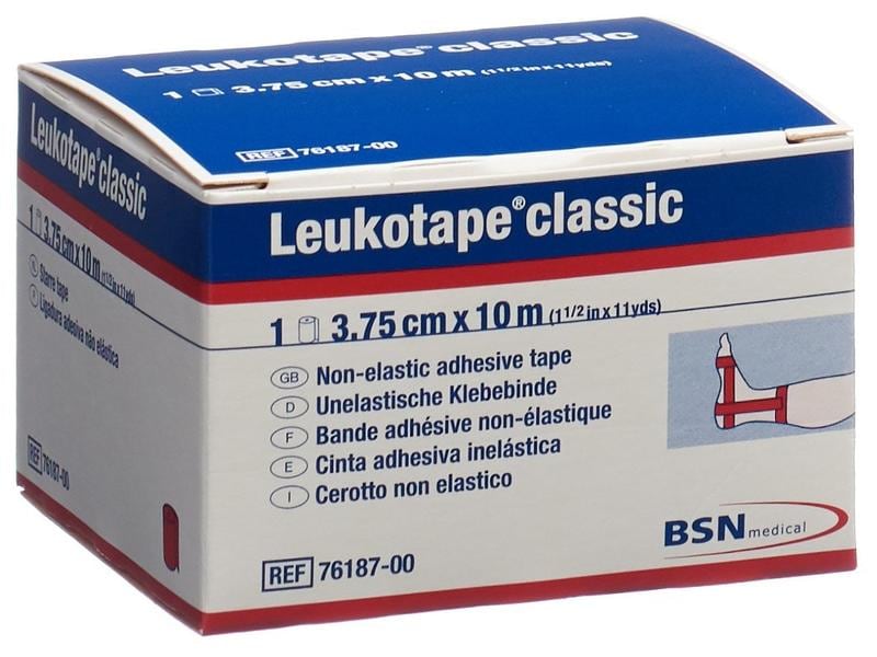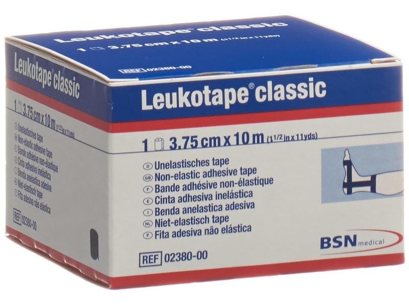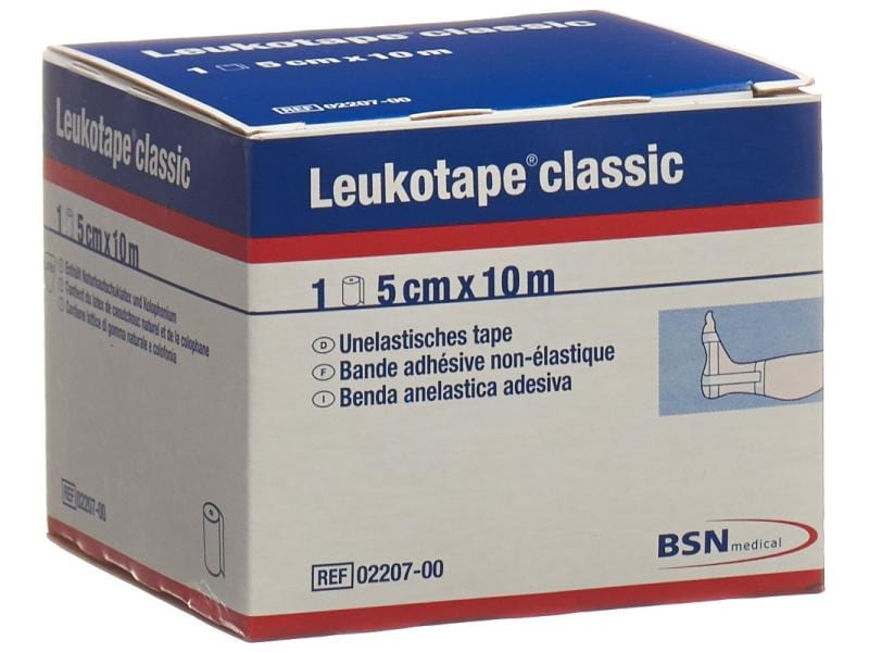 The Leukotape adhesive bandage is suitable for functional dressings for injuries to ligaments, joints and muscles. The non-elastic bandage has a high adhesive strength and is particularly tensile. It is made of water-repellent cotton fabric and is coated with a zinc oxide rubber adhesive. Thanks to the serrated edges, the material can be easily torn both lengthwise and crosswise. This makes it easy to apply the adhesive bandage without scissors.