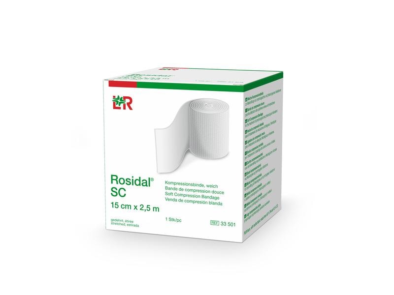 One bandage - several functions: The soft compression bandage Rosidal SC (Soft Compression) offers a safe solution as the first layer of a lymphological and phlebological compression bandage. The textile underside protects sensitive skin, distributes pressure evenly and reduces the tendency of the bandage to slip. Rosidal SC is available both individually and as a system component of Rosidal TCS and Rosidal Lymph.