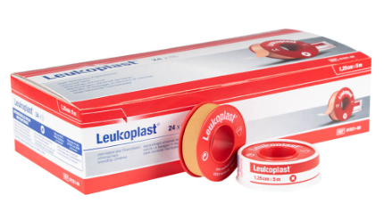 Thanks to their particularly high adhesive strength, Leukotape fixation plasters are ideal for fixing wound dressings, medical scenarios and all applications where a robust, skin-friendly plaster is required. Leukoplast is permeable to water vapor and air and has a water-repellent, skin-colored surface made of rayon.