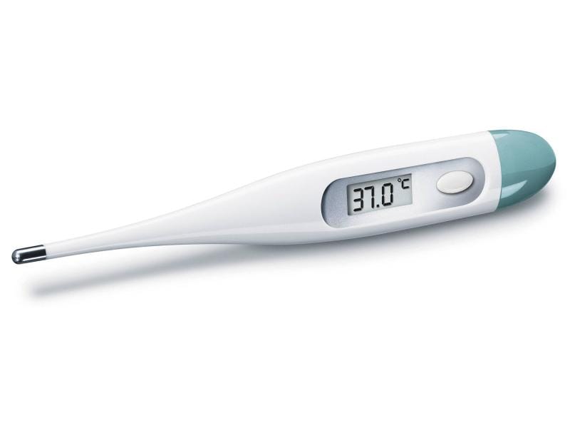 The Sanitas clinical thermometer SFT 01/01 measures your body temperature to an accuracy of 0.1 °C. It also stores the last measured value, is waterproof, disinfectable and mercury-free. The thermometer is supplied with a protective cover and battery.