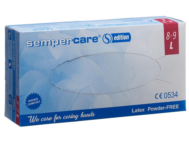 Non-sterile, powder-free examination glove made of natural latex. The examination gloves can be worn on both sides, with rolled edge. Very good tactile sensitivity and high wearing comfort. Non-slip surface with textured fingertips for safe instrument handling. Tear strength 6 N.