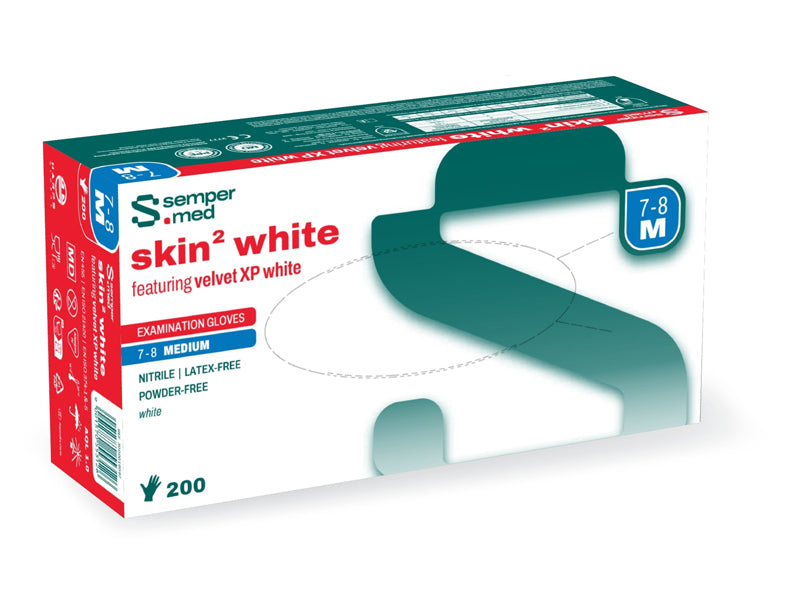 The Sempermed® Skin² White examination gloves made of high-quality nitrile butadiene rubber offer reliable protection and high wearing comfort, powder-free, non-sterile, can be worn on both sides, equipped with a practical rolled edge, latex-free, ideal for type I allergy sufferers, free of latex proteins, extra thin, good tactile sensitivity, category III protective equipment