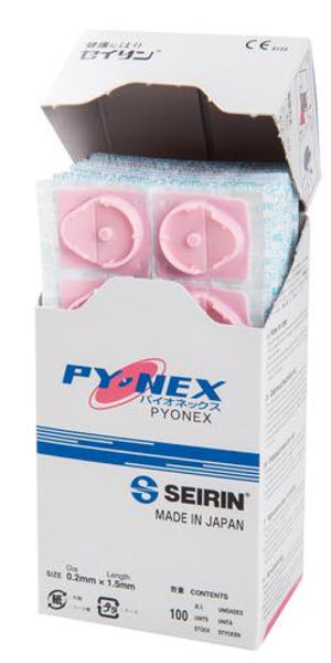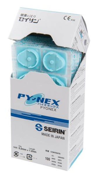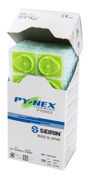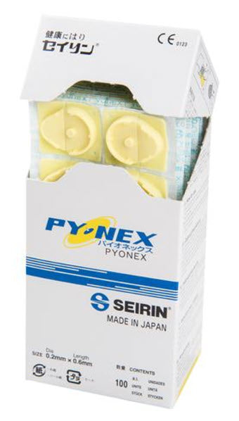 The Pyonex needle is integrated into a colored plastic carrier. The breathable plaster is stuck to the skin and for precise, secure and long-lasting fixation (at least 48 hours), even when washing or showering. The needle is concealed on the adhesive surface and is barely noticeable for the patient. The permanent needle is stimulated by light finger pressure on a clearly perceptible point on the top of the patch. This allows the patient to actively participate in the therapy and enhances the therapeutic effect. Another advantage is that parents can continue to treat their children carefully at home if necessary. The Pyonex needles are suitable for the body and, depending on the anatomical conditions, also for ear acupuncture points. Due to the availability of particularly short needles, Pyonex permanent needles are particularly suitable for children, pain-sensitive patients and people with needle phobia.