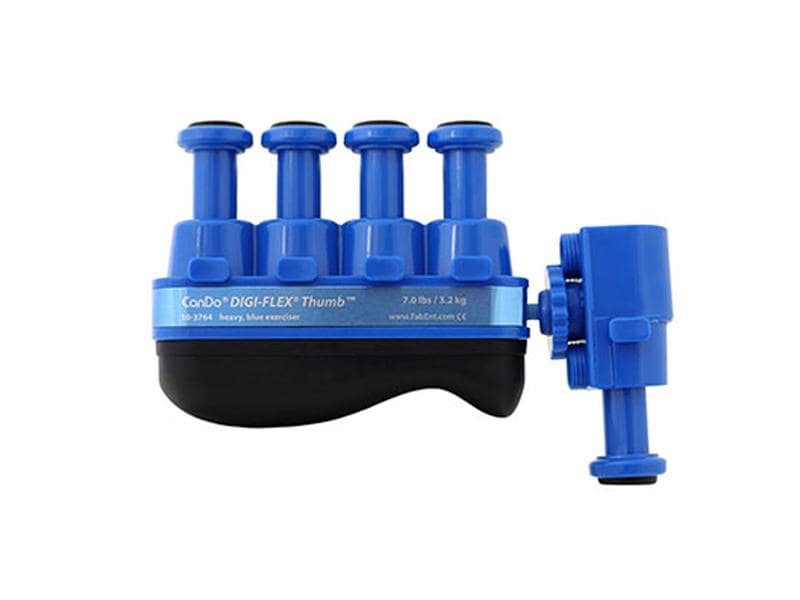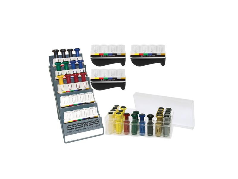 With the Digi-Flex, the fingers can be strengthened individually and separately. Finger mobility is increased at the same time as muscle coordination in the hand and forearm. The Digi-Flex's spring-loaded buttons isolate each finger so that the strong fingers do not take over the tasks of the weak fingers. This means that the whole rehabilitation process is better, faster and easier to control. The Digi-Flex is available in 8 color-coded units with staggered resistance (4 units per color). This makes it easier for the therapist to monitor progress. The ergonomic underside for stability and a good grip. Scope of delivery: 8x Digiflex hand trainer set consisting of 4x beige (0.34 kg) 4x yellow (0.68 kg) 4x red (1.361 kg) 4x green (2.268 kg) 4x blue (3.175 kg) 4x black (4.082 kg) 4x silver (4,990 kg) 4x gold (5.897 kg) 1x display