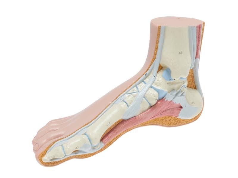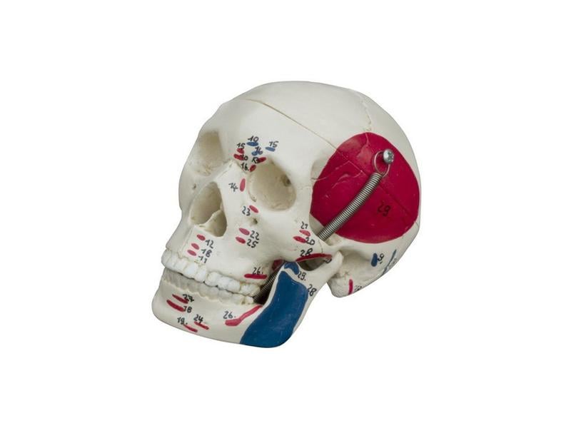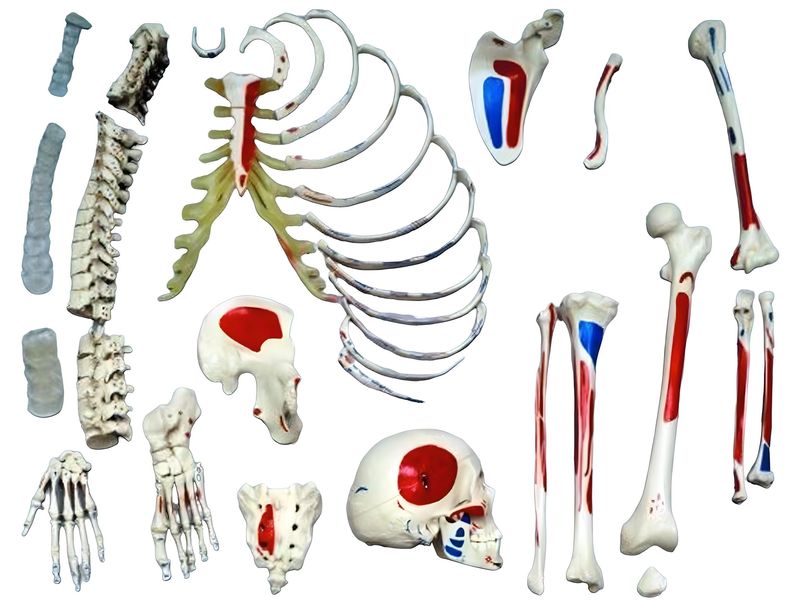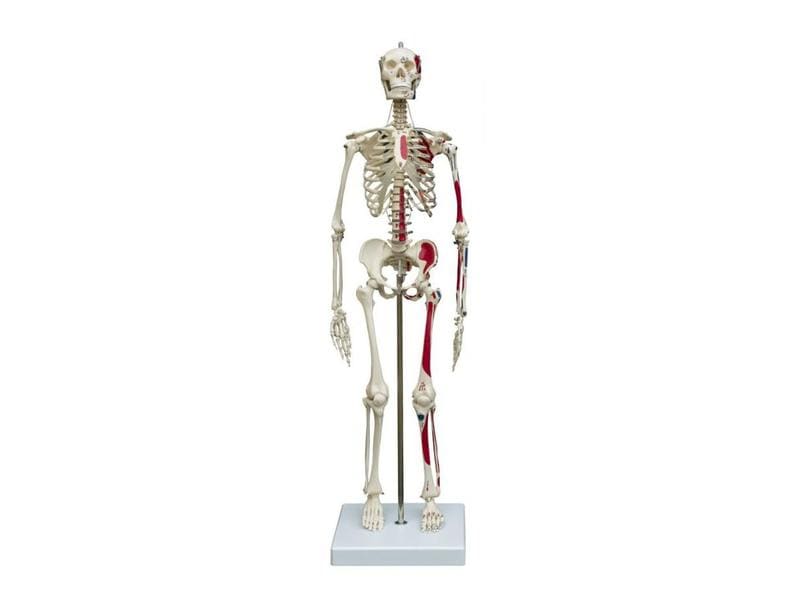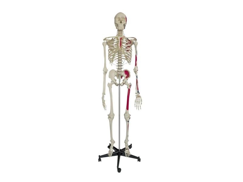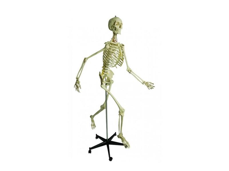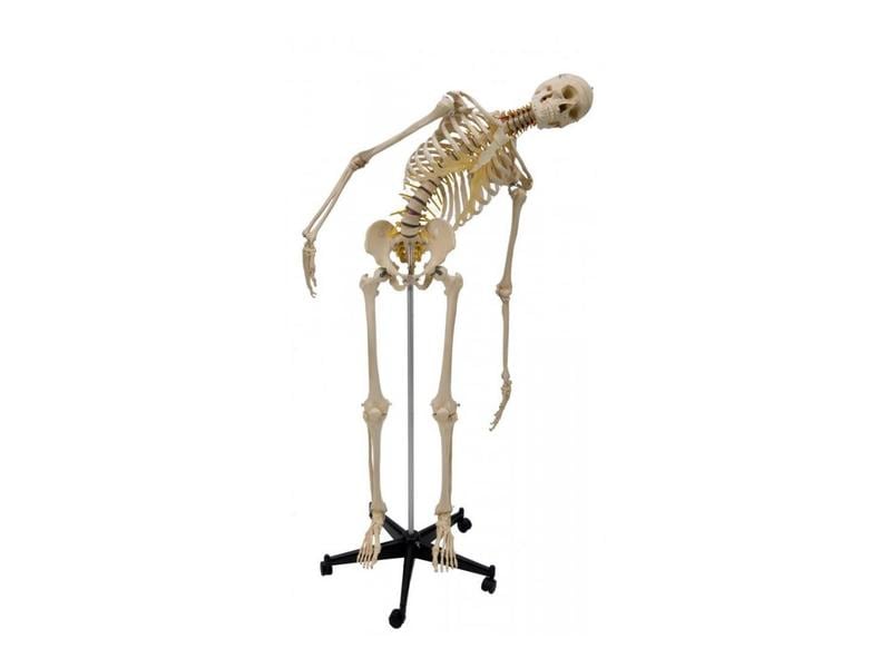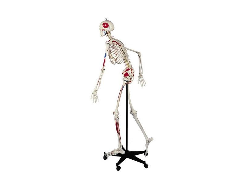 The skeleton is provided with muscle painting and, in the fully flexible version, with a flexible spine, nerve / artery cords, herniated disc or hernia. The flexibility allows natural movements and curves of the upper body to be shown. In addition, the sacrum is opened and equipped with a bone flap to illustrate the course of the nerve endings in the sacrum and the entry into the pelvic area. The painting and numbering is done by hand. With description.
