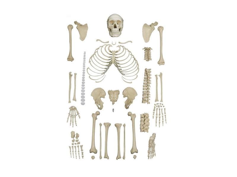 With 18-part plug-in skull. The skeleton and skull are 100% replicas of natural bone specimens with ideal bone structures. All details of human bones are reproduced exactly.