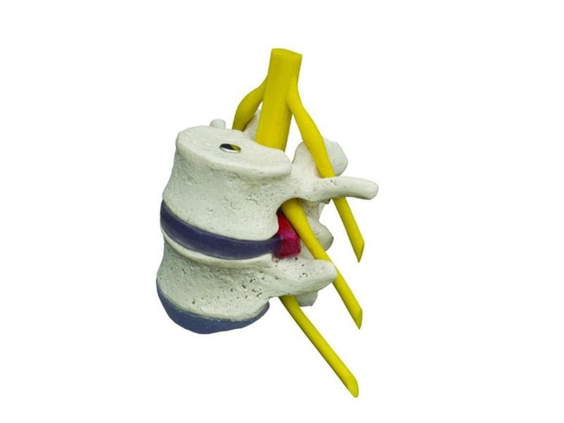 The components of the model are two vertebrae with an elastic intervertebral disc, spinal cord and nerves.