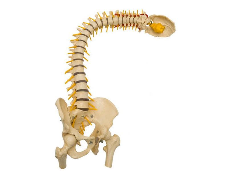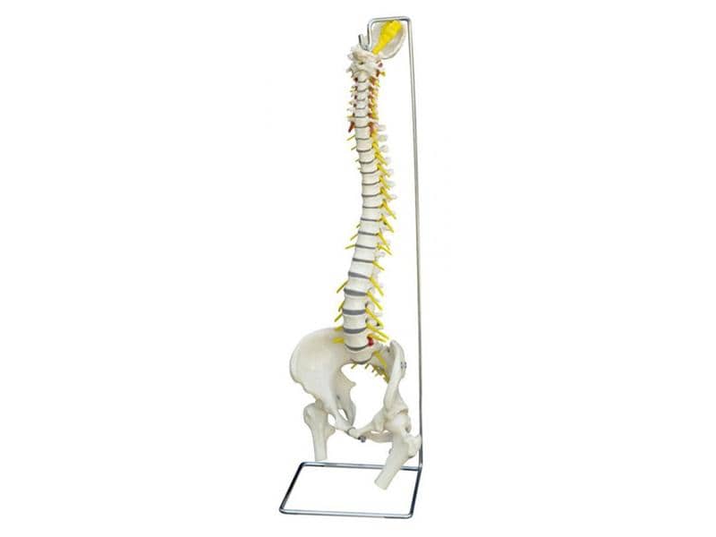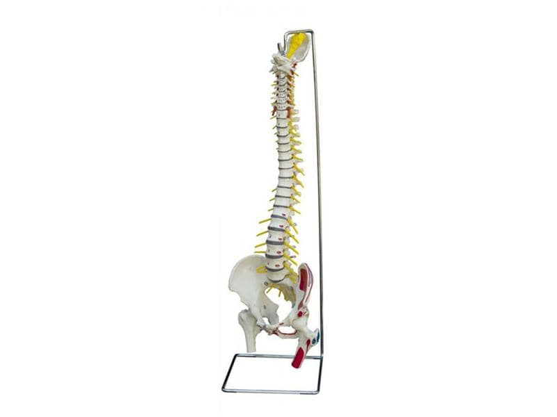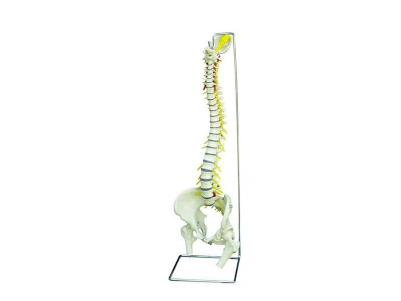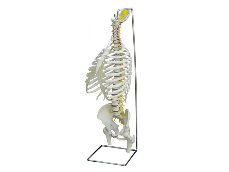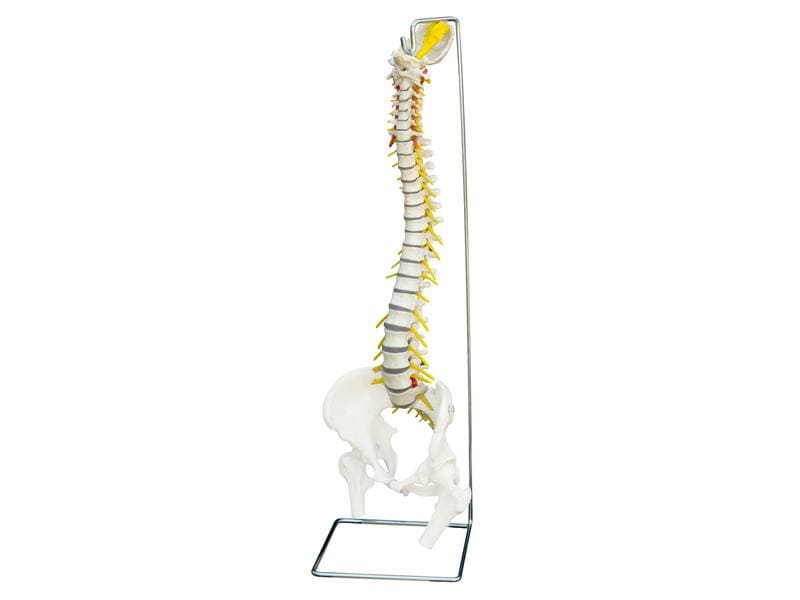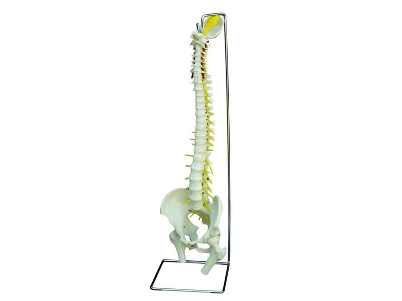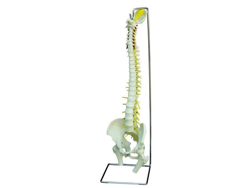 The A212.4 spinal column model is a lifelike cast of a real human spinal column (approx. 80 cm). All details are excellently represented, with occipital bone, nerves, arteries and movable femoral stumps. Fully flexible model: curvatures, tensions and other pathological manifestations can be represented. The sacrum is opened at the back by a bone flap to show the course of the nerves within the bone. With stand.