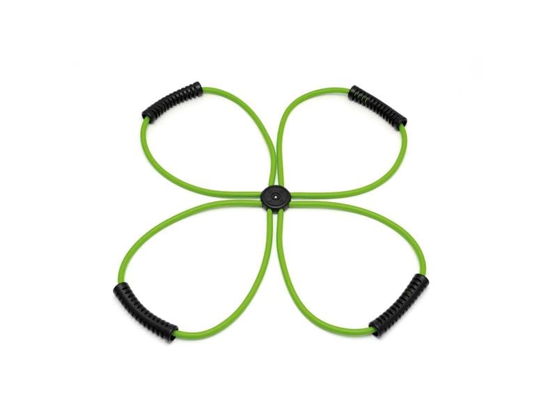 Excellent for upper and lower body training, strength building and toning. It is made of flexible plastic with a soft, rubberized shell and is designed for home or gym use. Padded handles on both the inside and outside of the ring provide maximum comfort. The resistance is similar to a 3-band spring circuit.