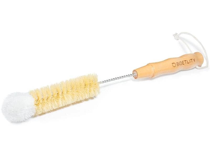 La brosse de nettoyage s'adapte parfaitement au corps du biberon de la douche pour fesses. Nous recommandons de nettoyer régulièrement le corps du biberon. Les poils sont en sisal (fibres naturelles provenant des feuilles de certains agaves).