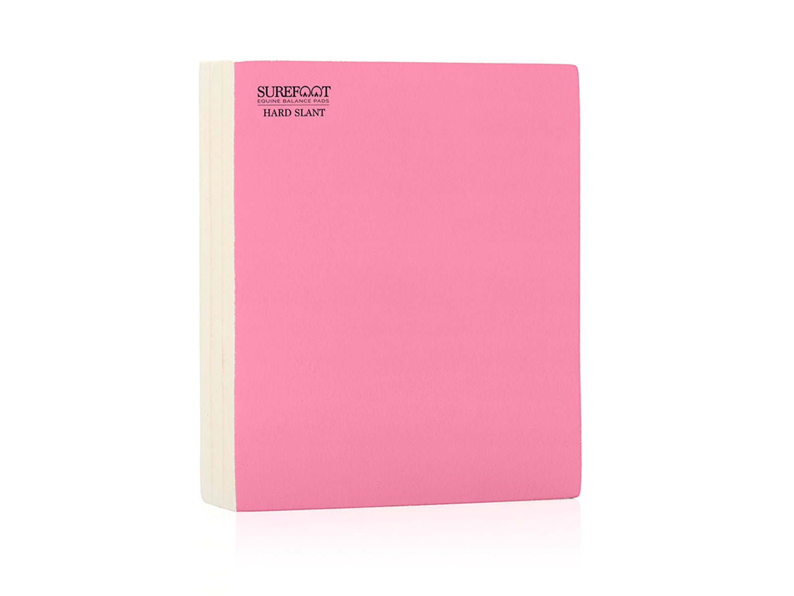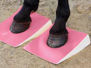 Les Hard Slants sont fabriqués dans le même matériau que les Hard Pads, mais sont découpés à un angle de trois pouces. Ils doivent être utilisés avec le côté coloré vers le haut. Bien qu'ils s'adaptent facilement sous l'effet de la chaleur et de la pression du sabot, ils ne cèdent pas latéralement, de sorte que l'angle reste constant même sous le poids du cheval.